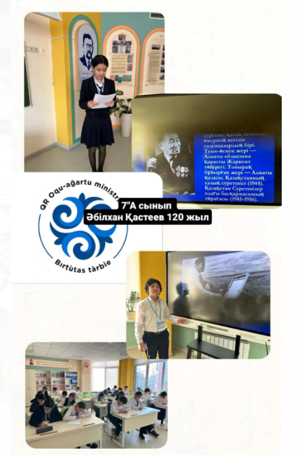 Біртұтас тәрбие жоспары бойынша 9-шы қаңтар Әбілхан Қастеевтің туғанына 120жыл толуына орай, « Әбілхан Қастеев-қазақтың тұңғыш суретшісі" тақырыбында 6,7,8 сыныптарға бірыңғай сынып сағаты ұйымдастырылды.