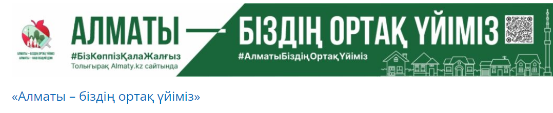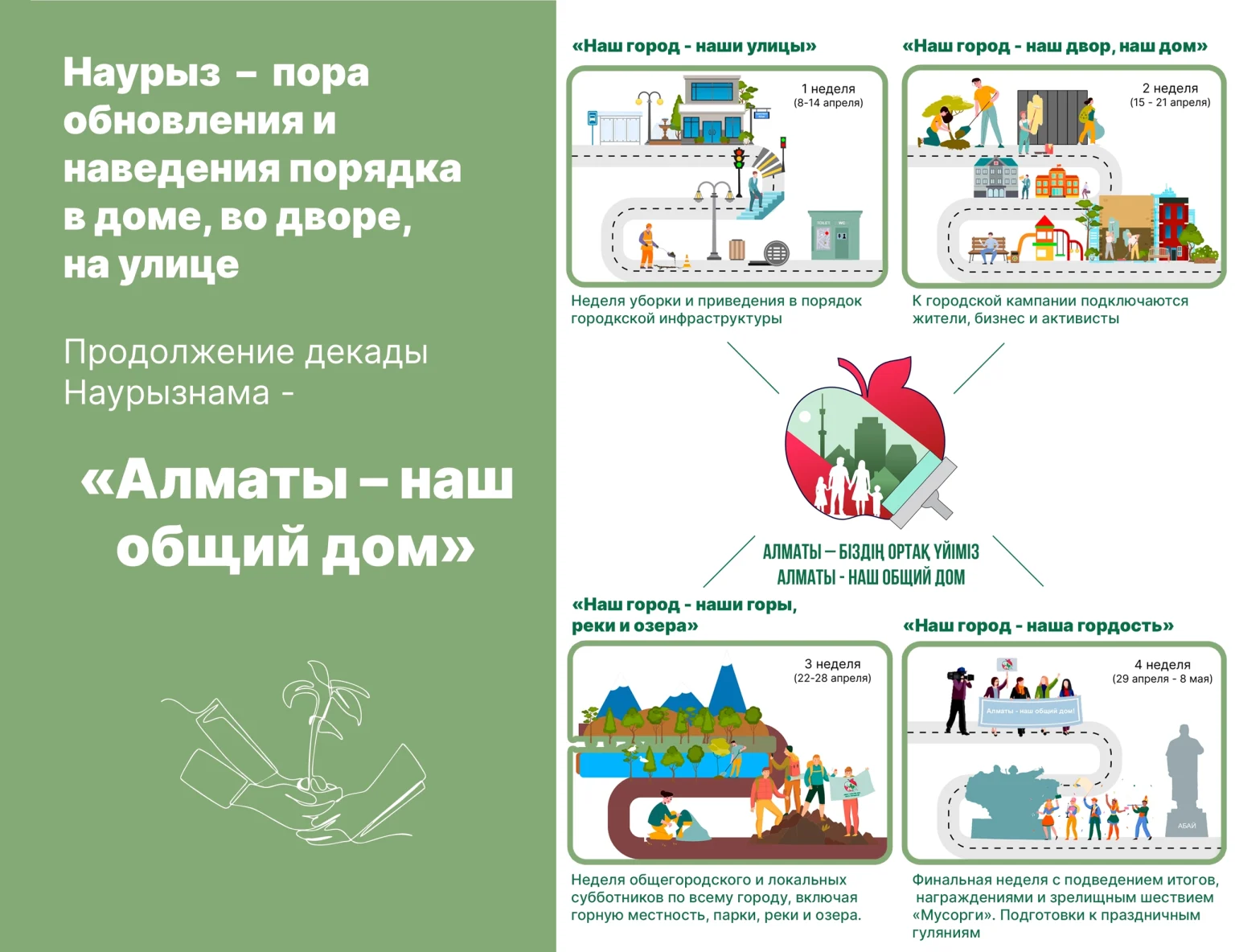 «Алматы – біздің ортақ үйіміз»8 сәуір мен 8 мамыр аралығында қаланың барлық ауданында қоқыс жинау, қалалық инфрақұрылым нысандарын тазарту, жаппай ағаш отырғызу бойынша іс-шаралар өткізіледі.«Алматы – біздің ортақ үйіміз» науқаны 4 негізгі кезеңге бөлінген.«Алматы – біздің ортақ үйіміз» науқанының мақсаты – тұрғындардың қаланың инфрақұрылымы мен қоғамдық мүлікке жауапкершілікпен қарау құндылығын қалыптастыру, жеке экологиялық бастамаларды қолдау мен іске асыру үшін жағдай жасау, халық арасында жоғары азаматтық жауапкершілік пен экологиялық мәдениетті тәрбиелеу.