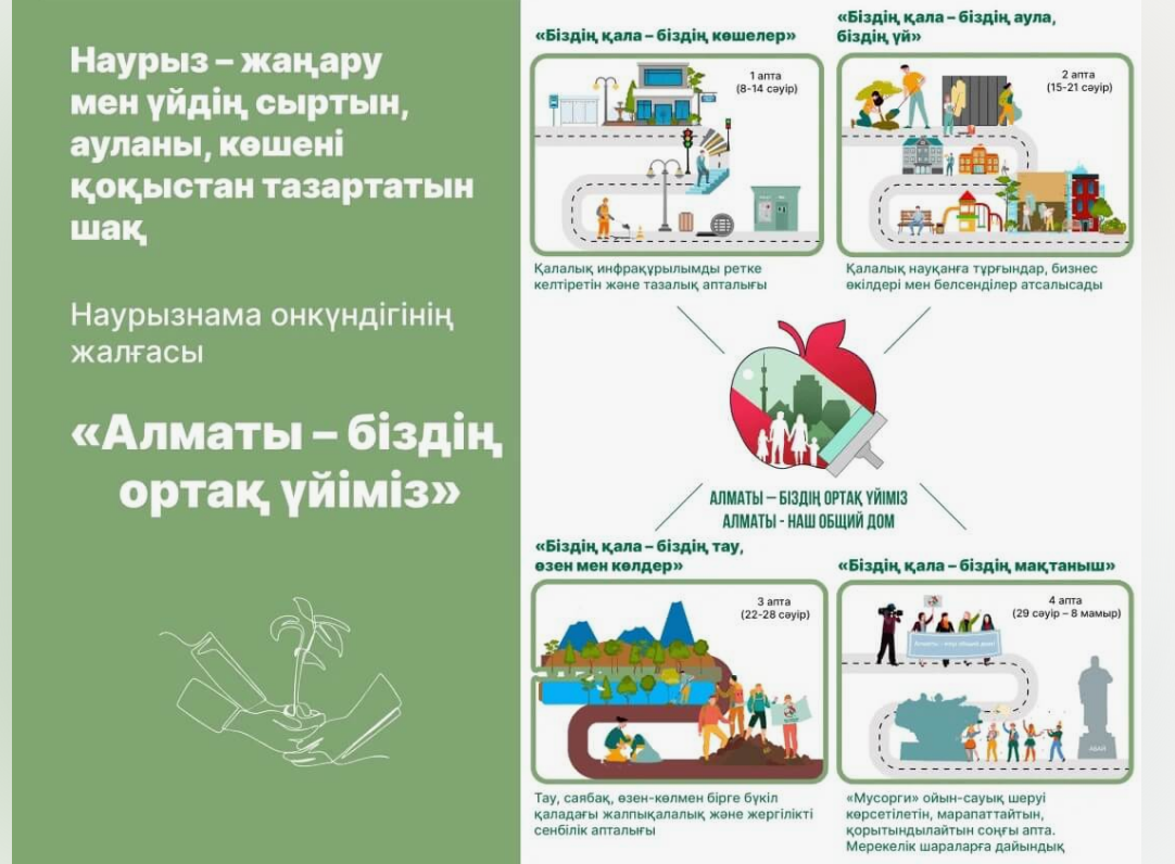 8 сәуір мен 8 мамыр аралығында қалада «Алматы – біздің ортақ үйіміз» науқаны өтеді. Қаланың барлық ауданын қамтитын науқанға Алматының әрбір тұрғыны мен қонағы қатыса алады.