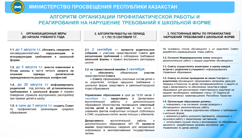 5. Обязательная школьная форма организаций среднего образования (далее - школьная форма) соответствует светскому характеру обучения. Фасон, цвет школьной формы выдерживаются в классическом стиле, в единой цветовой гамме, с допущением смешения не более трех цветов. Цвет школьной формы выбирается из спокойных и не вызывающих ярких тонов.6. Школьная форма вводится с учетом возрастных особенностей обучающихся.