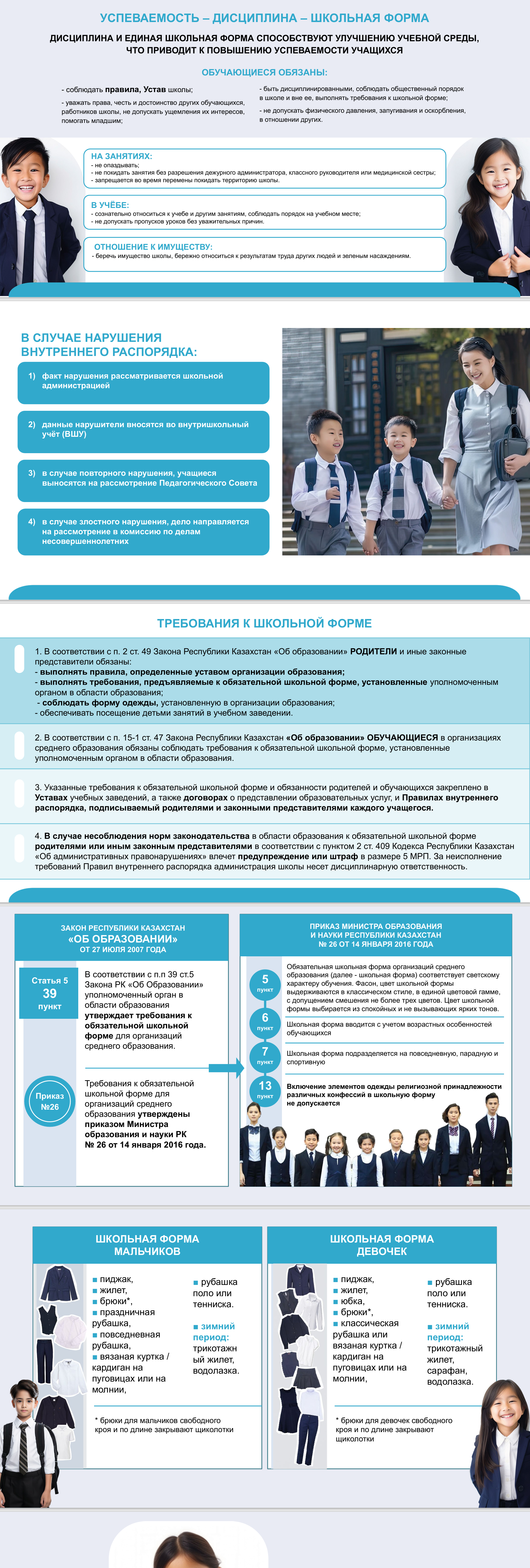 1. В соответствии с п. 2 ст. 49 Закона Республики Казахстан «Об образовании» РОДИТЕЛИ и иные законные представители обязаны: - выполнять правила, определенные уставом организации образования; - выполнять требования, предъявляемые к обязательной школьной форме, установленные уполномоченным органом в области образования; - соблюдать форму одежды, установленную в организации образования; - обеспечивать посещение детьми занятий в учебном заведении. 2. В соответствии с п. 15-1 ст. 47 Закона Республики Казахстан «Об образовании» ОБУЧАЮЩИЕСЯ в организациях среднего образования обязаны соблюдать требования к обязательной школьной форме, установленные уполномоченным органом в области образования. 3. Указанные требования к обязательной школьной форме и обязанности родителей и обучающихся закреплено в Уставах учебных заведений, а также договорах о представлении образовательных услуг, и Правилах внутреннего распорядка, подписываемый родителями и законными представителями каждого учащегося. 4. В случае несоблюдения норм законодательства в области образования к обязательной школьной форме родителями или иным законным представителями в соответствии с пунктом 2 ст. 409 Кодекса Республики Казахстан «Об административных правонарушениях» влечет предупреждение или штраф в размере 5 МРП. За неисполнение требований Правил внутреннего распорядка администрация школы несет дисциплинарную ответственность.
