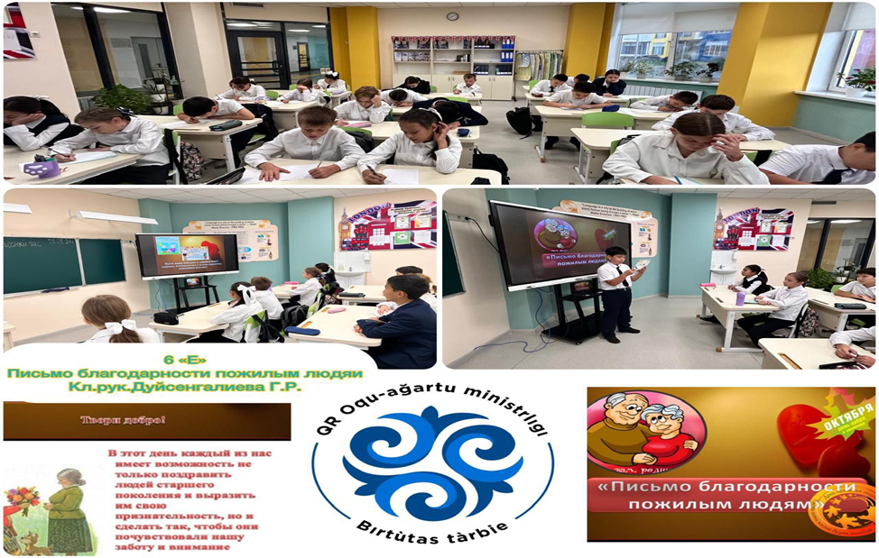 Бүгін 23.09.2024 жыл күні № 205 жалпы білім беретін мектепте 5,6,7 сыныптарында «Қарт адамға арналған ашық хат» тақырыбында сынып сағаты өткізілді.