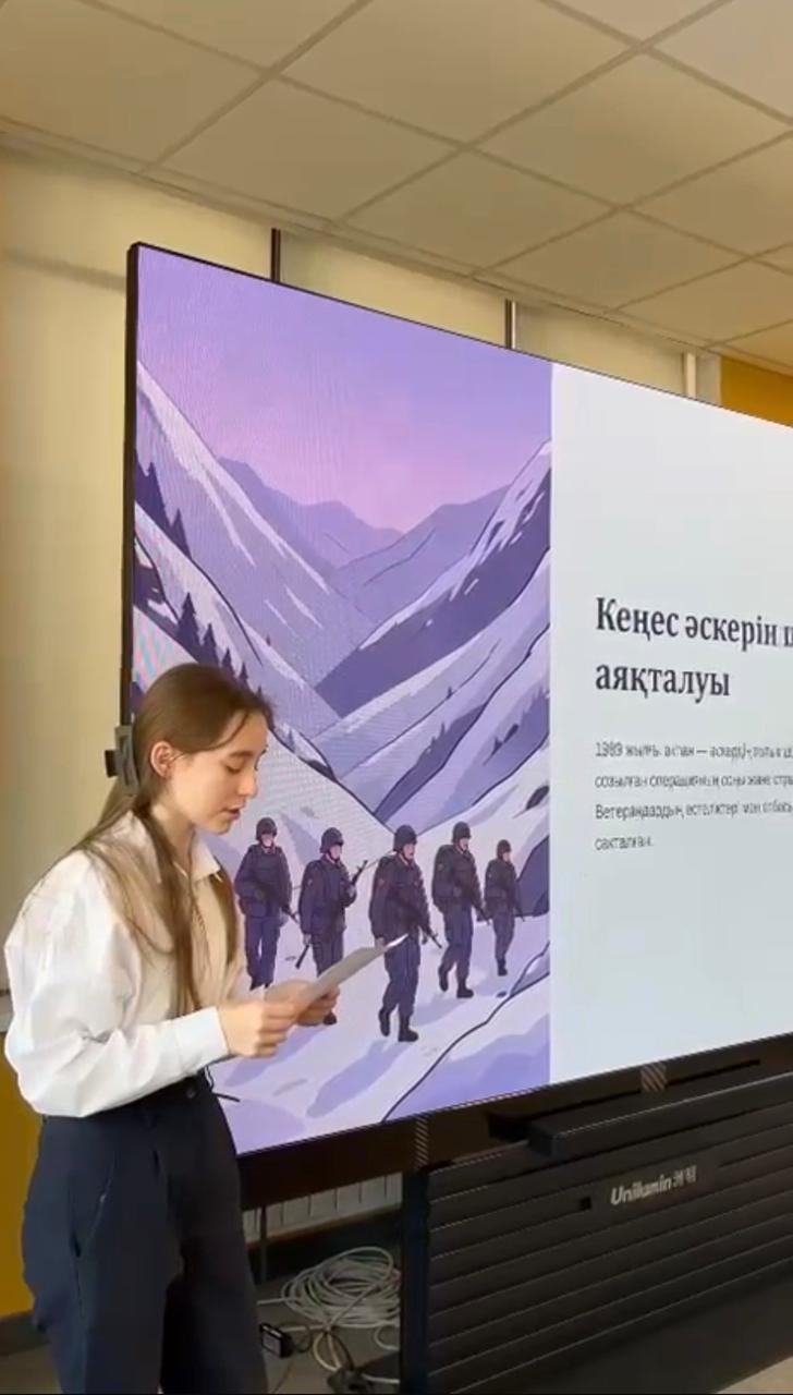 2026 жылдың 19 ақпан күні мектеп кітапханасында «Отты жылдар жаңғырығы» тақырыбында қазақ тілі мен әдебиеті пәні мұғалімдері Жылқайдар Гүлжанат, Кыдырмоллаева Кундуздың ұйымдастыруымен «Ауған соғысы» жайлы оқушыларға LED экраннан бейнероликтер көрсетіліп, тарихи шолу жасады.