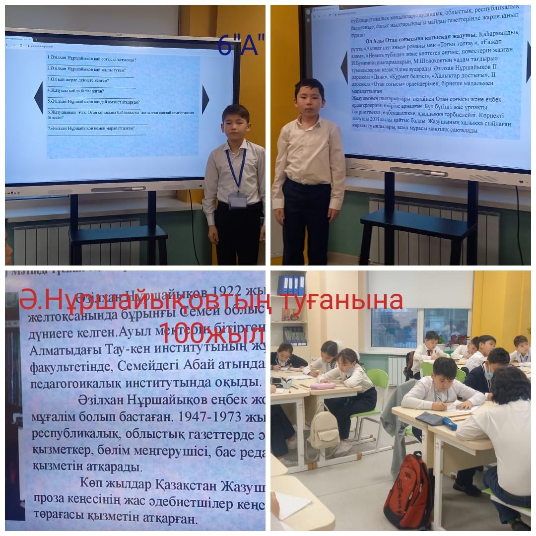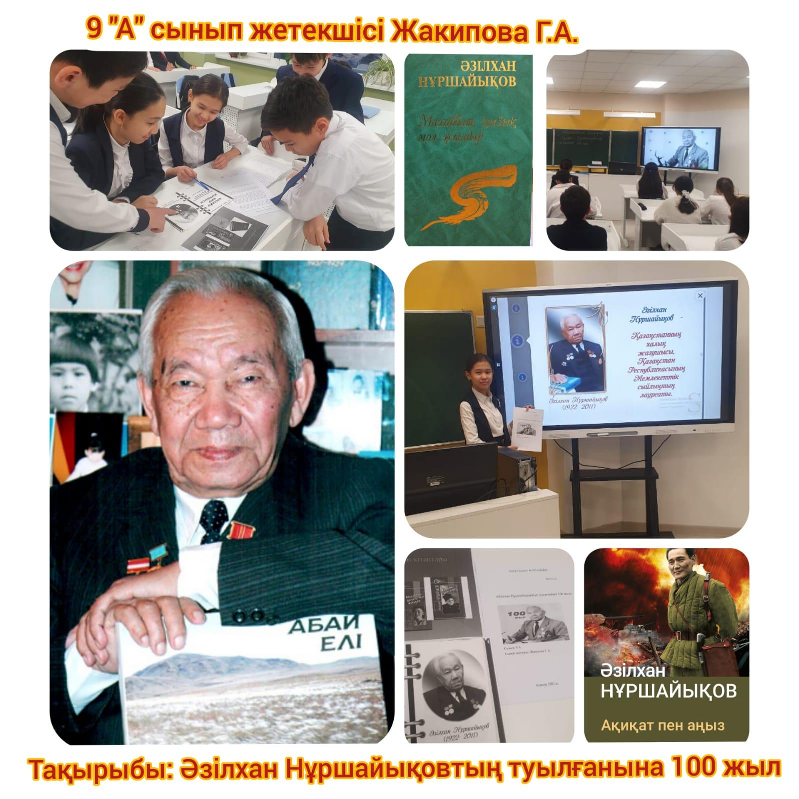 Биыл Қазақстанның халық жазушысы, ҚР Мемлекеттік сыйлықтың лауреаты Әзілхан Нұршайықовтың туғанына 100 жыл толды. Дәуірдің кемеңгер қаламгер әдебиет атты мұхиттың, буырқанған жағасына өлеңмен келіп, кейін әлемнің назарын өзіне аударылған шебер жазушы, майдангер жазушы Әзілхан Нұршайықовтың туғанына 100- жыл толуына орай " Әйгілі Әз аға -атты " мектеп кітапханасында көрме ұйымдастырылды. 20 желтоқсан 2022 жылы 5-10 сыныптар белгілі жазушы Ә.Нұршайықовтың 100 жылдығына арналған "Аңызды ақиқатқа айналдырған" қаламгер тақырыбында сынып сағаттары өтті.