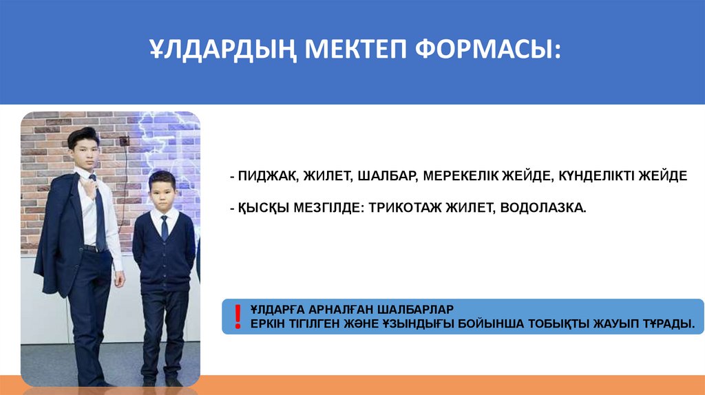 Ұлдарға арналған мектеп формасына мыналар кіреді: