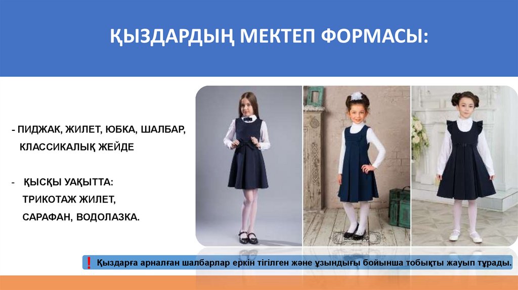 - пиджак, жилет, юбка, шалбар, классикалық блузка немесе түймелері әлде сыдырмалы құлып бар тоқылған куртка/кардиган, поло жейде немесе футболка (қыста: тоқылған жилет, сарафан). Қыздарға арналған шалбар аяқтың тобығын жауып тұруы шарт.