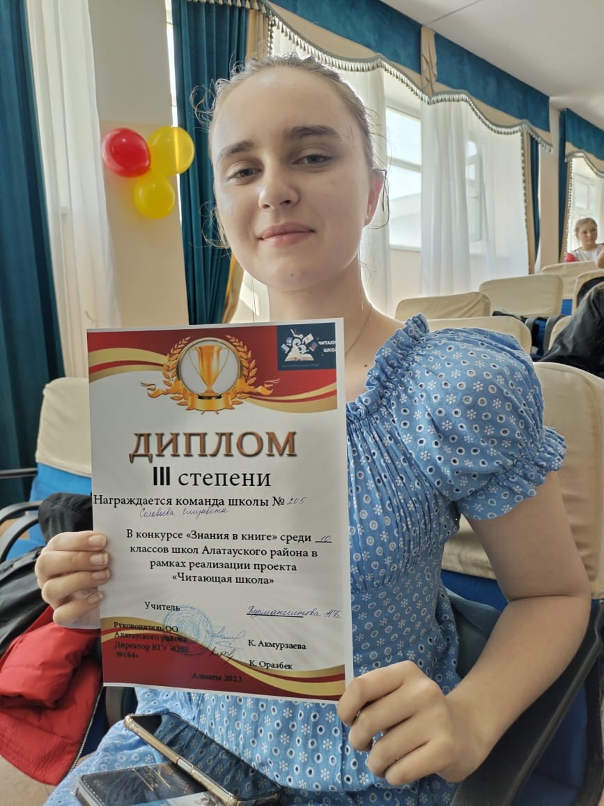 13 апреля в ОШ 184, прошел конкурс среди 10 классов проекта «Читающая школа» в рамках реализации поручений Главы Государства К.К.Токаева, среди школ Алатауского района г.Алматы на тему : «Знания в книге». Цель конкурса: способствовать развитию навыков чтения среди учащихся, повышать интерес к художественной литературе. Формирование у учащихся навыков чтения и читательской грамотности. Ученица 10 «Б» класса, нашей школы Соловьева Елизавета, руководитель Курмансеитова А.Б. была награждена Дипломом III степени. Конкурс проходил в 3 этапа. Первый этап: защита проекта пьесы «Гроза» Н.А. Островского, впечатления от прочитанного произведения в формате презентации. На втором этапе: инсценировка отрывка из произведения. Елизавета защитила проект соблюдая регламент и дескриптор конкурса. @alatau_bilim_bolimi @akmurzaevakarlygash