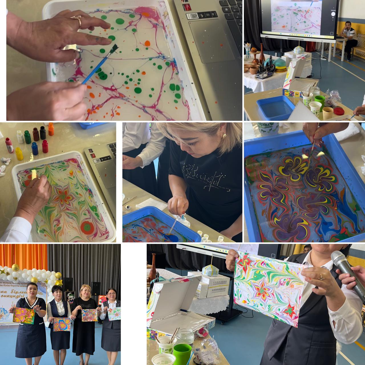 Осы орайда, "Сиқырлы бояу" үйірмесінің жетекшісі Тауманова Г.К. "Эбру" техникасында суда сурет салу шебер-сыныбын өткізді. Шебер-сыныпқа мектептің ұстаздары мен оқушылары белсене қатысып, оң әсерін алды.