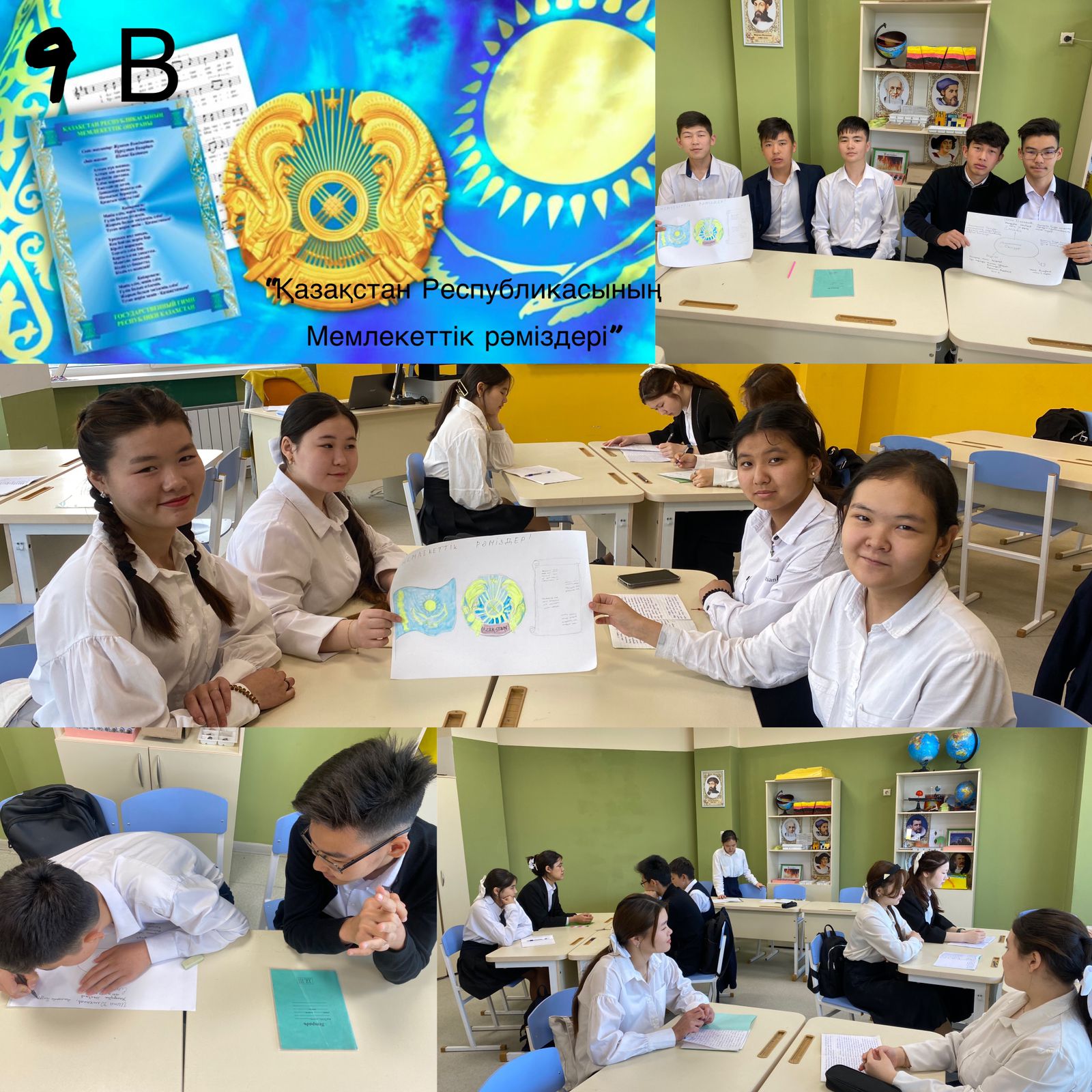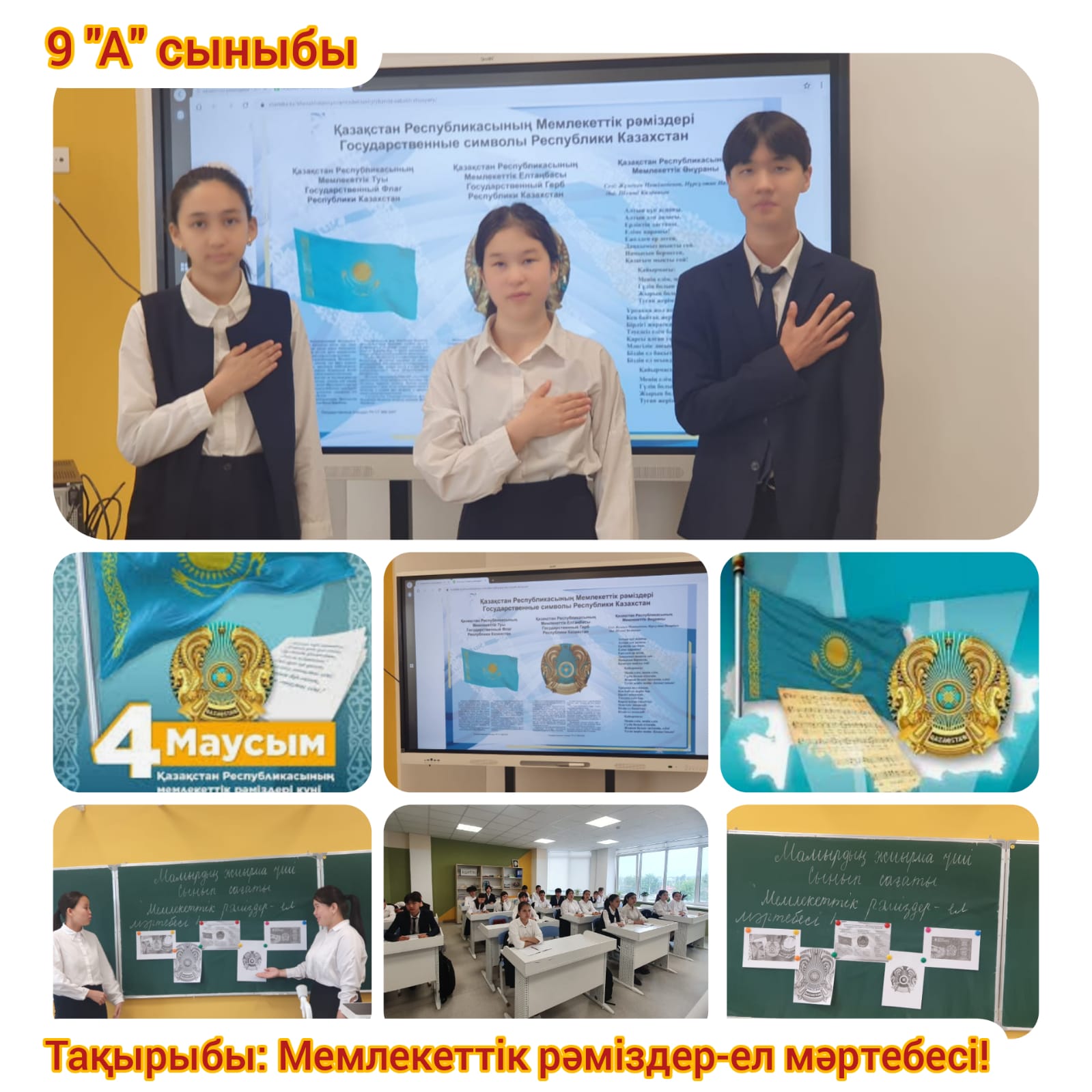«Мемлекеттік рәміздер-ұлт мақтанышы» тақырыбында 5 «А» ,5 «В»,5 «Г»,5 «Е», 6 «А»,6 «Ә» ,7 «А»,7 «Б»,7 «Ғ» ,8 «А»,8 «Ғ»,9 «А», 9 «Ә», 9 «В»,10 «Ә» сыныптары тәрбие сағаттарын өткізді..