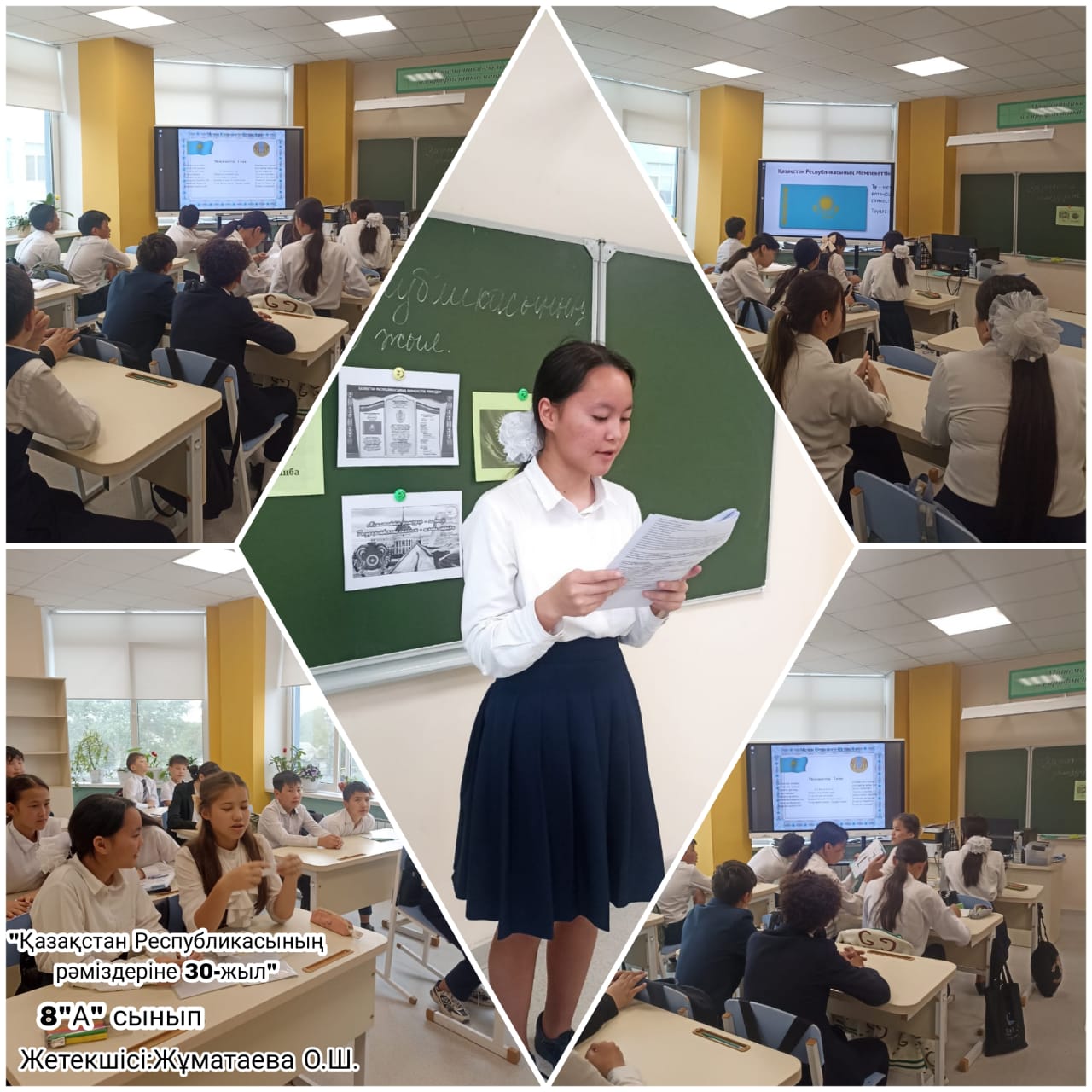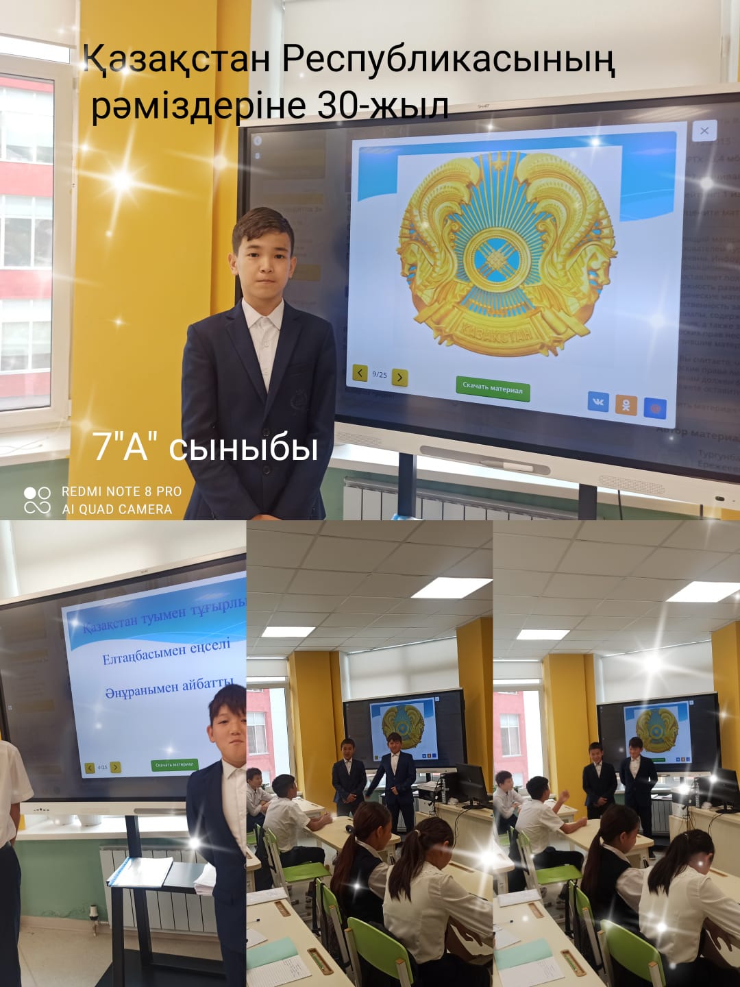 Оқушыларға LED экраннан «Қазақстан Республикасының рәміздеріне 30 жыл» тақырыбына презентация арқылы танымдық сабақтар көрсетілді. «Көк аспан», «Қыран», «Алтын дән» тобы болып бөлініп,рәміздер туралы жинаған деректерін ортаға салды. «Кім зерек?»тапсырмаларын орындады.Рәміздердің белгілерін сипаттап жазды.Ақ қағазға мемлекеттік тудың суретін салып.Ибрагим Ескендірдің орындауында «Көк тудың желбірегені»атты әнін тыңдады.