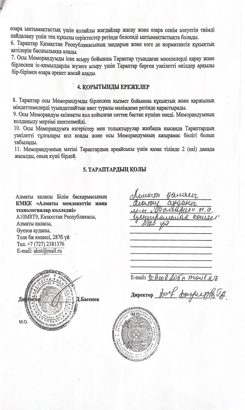 МЕМОРАНДУМ- "Алматы мемлекеттік жаңа технологиялар колледж"