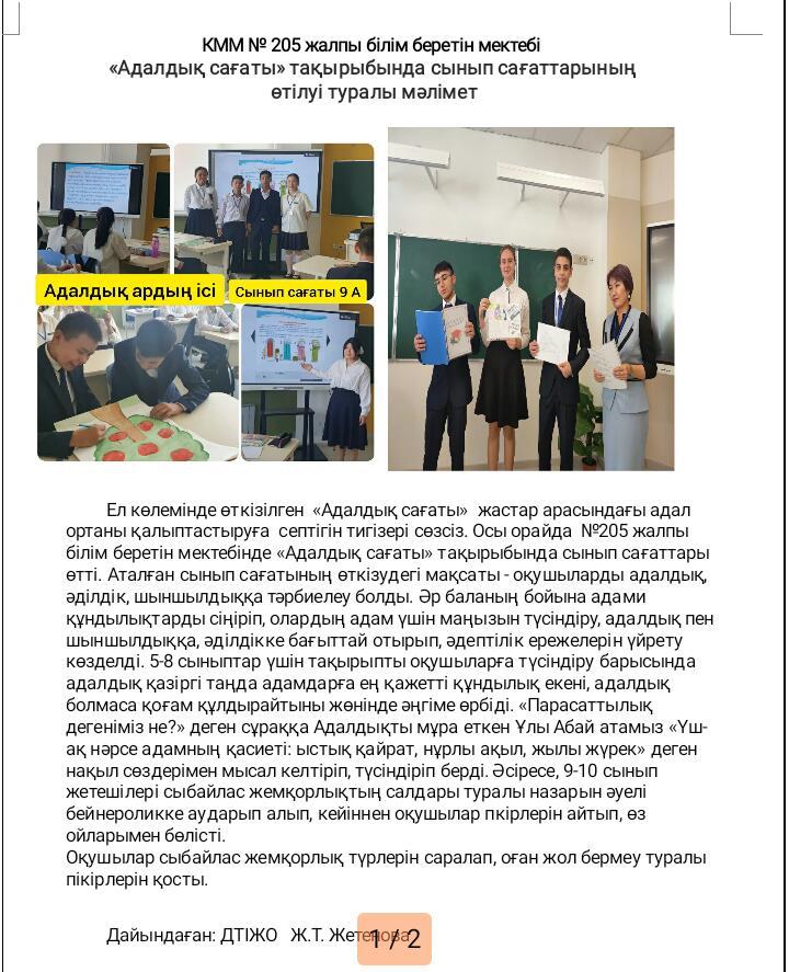 "Адалдық сағаты" тақырыбында сынып сағаттарының өтілуі