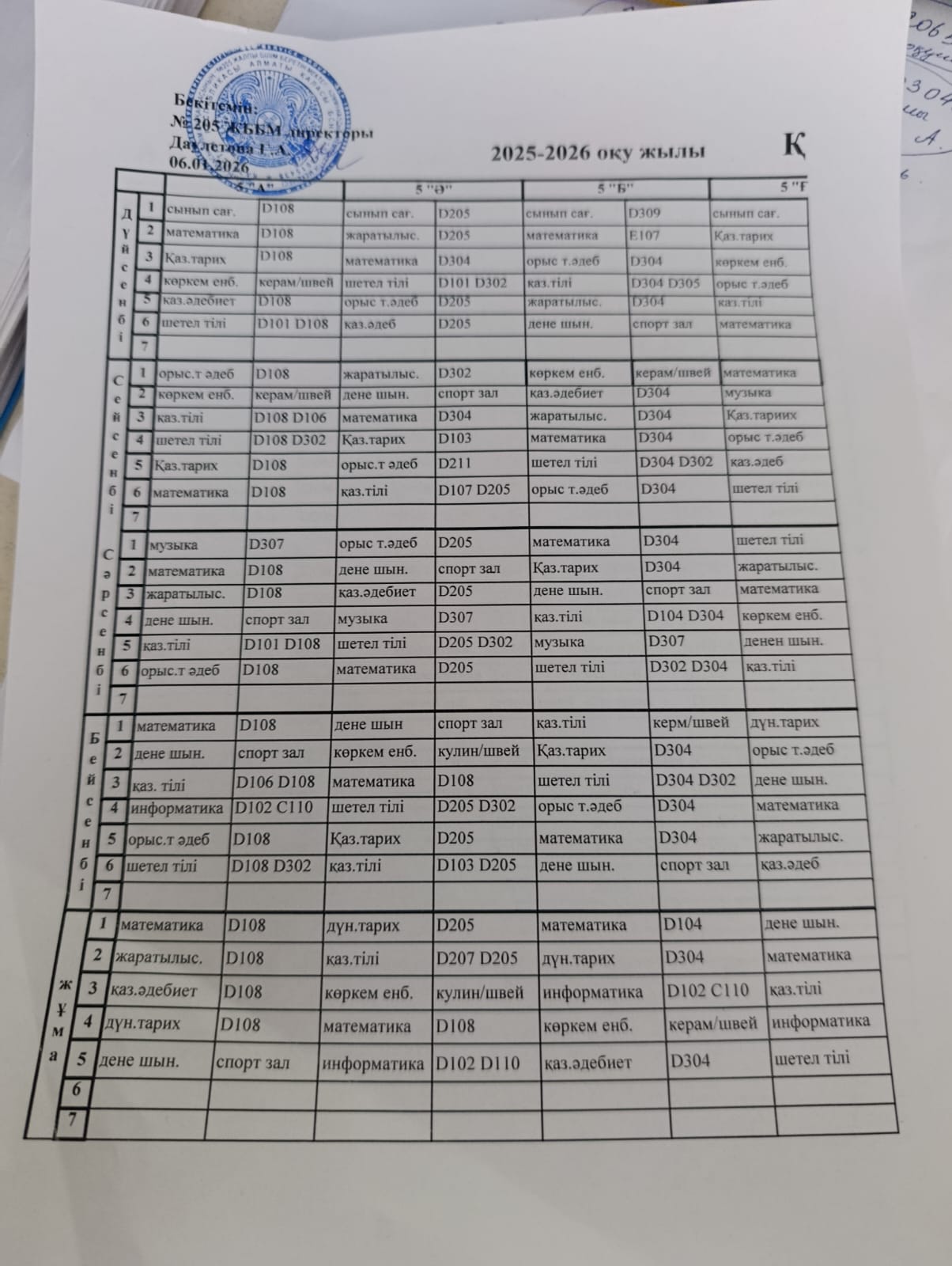№205 ЖББ мектебінің 2025-2026 оқу жылының сабақ кестнесі/Расписание 2-жартыжылдық/полугодие